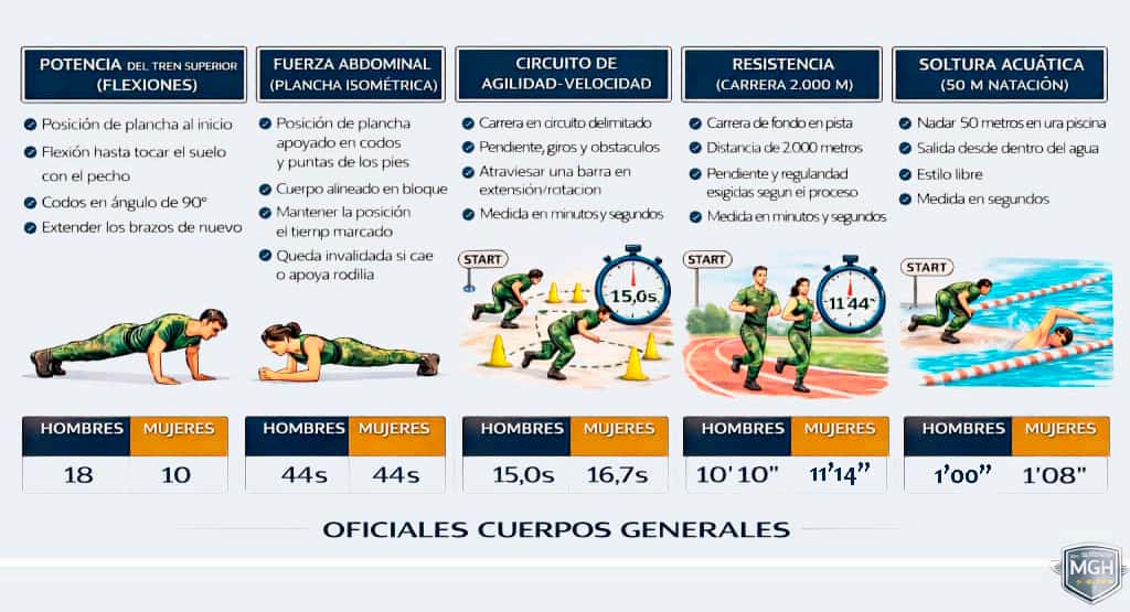 🟨 Pruebas de aptitud física con ejercicios de potencia de tren inferior (flexiones), fuerza abdominal (plancha isométrica), circuito de agilidad-velocidad, resistencia (carrera de 2.000 metros), soltura acuática (natación 50 m).