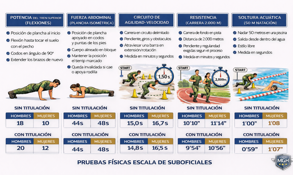 🟨 Nuevas Pruebas Físicas: potencia tren superior (flexiones) , fuerza abdominal (plancha isométrica), resistencia (2 km), circuito de agilidad-velocidad y natación (50 m). Haz clic en la imagen.